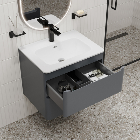Два выдвижных ящика с механизмом плавного доведения, одна распашная дверца.